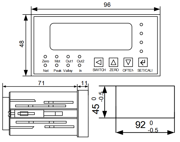 特点及用途: 1.可选用5位或6位数码管显示。 2.可以加RS232、RS485或者模拟量输出三选一。 3.开关量可以选择晶体管或者继电器。 4.峰谷值测量,上下限报警。